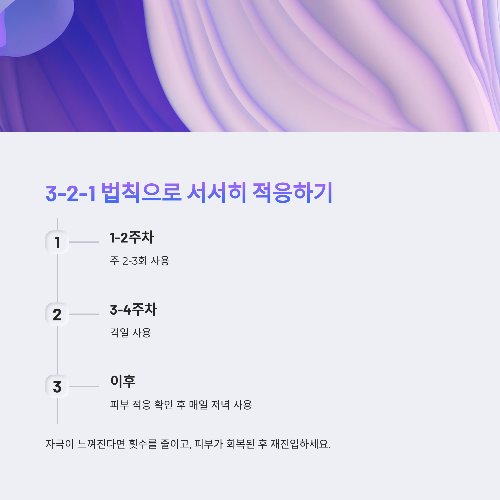 자극이 느껴진다면 다시 횟수를 줄이고, 피부가 회복된 후 재진입하세요.