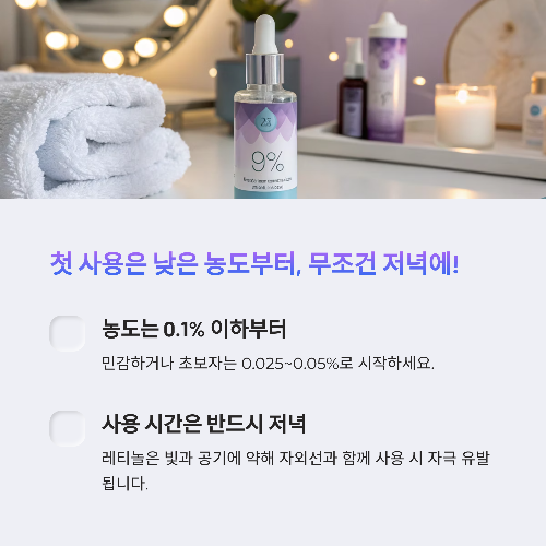 👉 민감하거나 레티놀 초보자는 0.025~0.05%로 시작