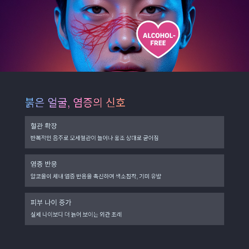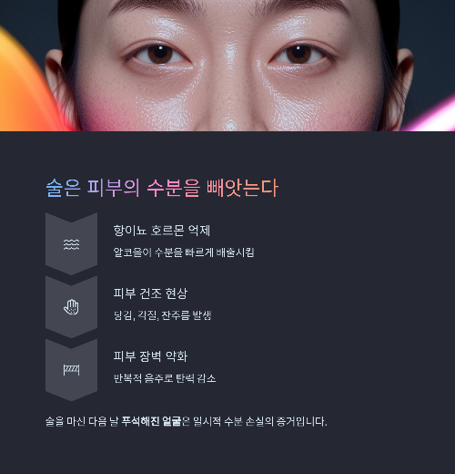알코올은 수분 부족, 혈관 문제, 염증, 간 기능 저하, 산화 스트레스 등 다양한 방식으로 피부에 부정적 영향을 주며,