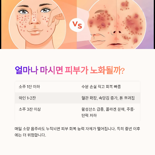 | 소주 3잔 이상 / 맥주 500ml 이상 | 활성산소 급증 → 콜라겐 분해, 주름·탄력 저하 |