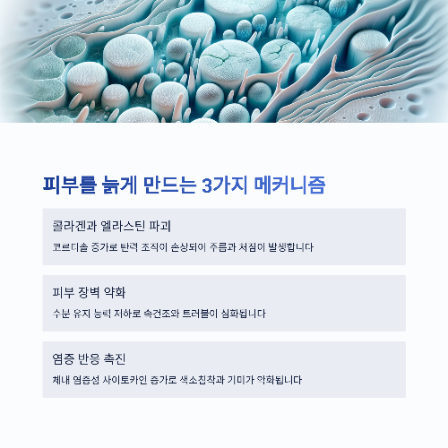 | 코르티솔 증가 | 잔주름·탄력 저하, 피부 얇아짐 |