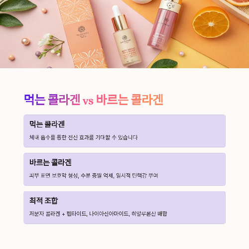 콜라겐은 크게 "섭취용(먹는)과 바르는 제품(앰플, 세럼)"으로 나뉩니다.