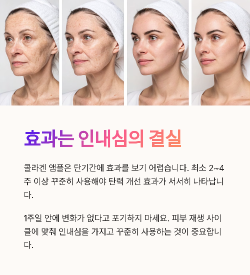 콜라겐 앰플은 2~4주 이상 꾸준히 써야 탄력 개선 효과가 서서히 나타납니다.