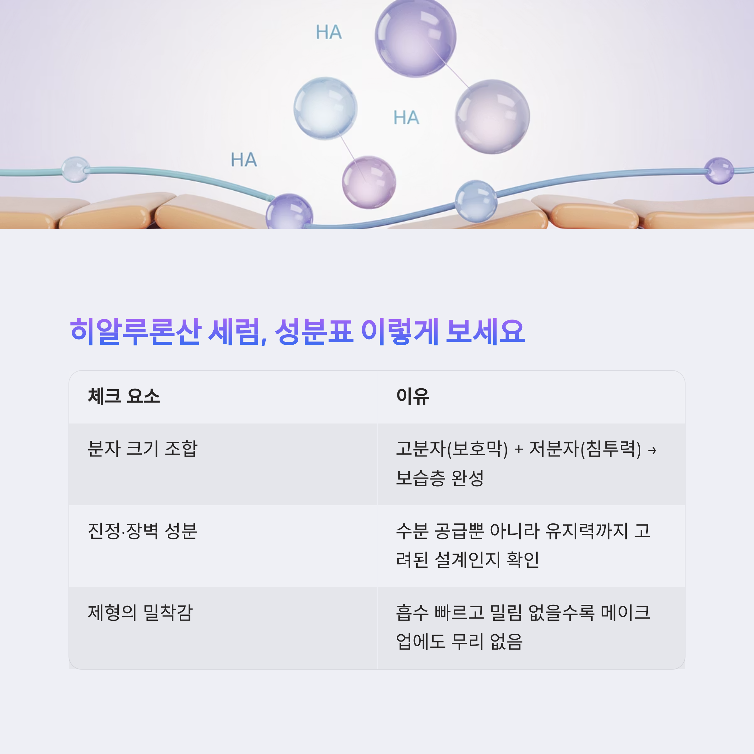 | 분자 크기 조합 여부 | 고분자(보호막) + 저분자(침투력) → 보습층 완성 |