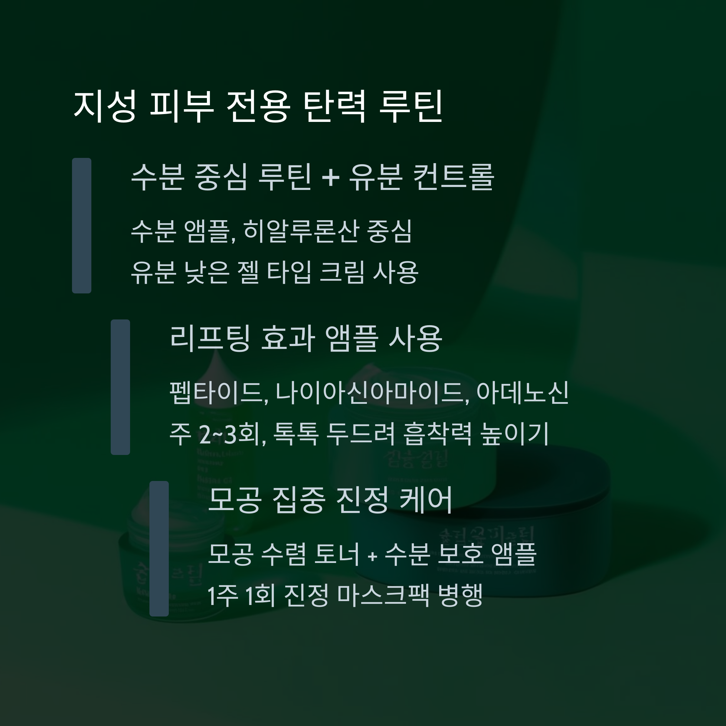 3️⃣ “지성 피부 전용 탄력 루틴은 이렇게 다르게 접근해야 해요”