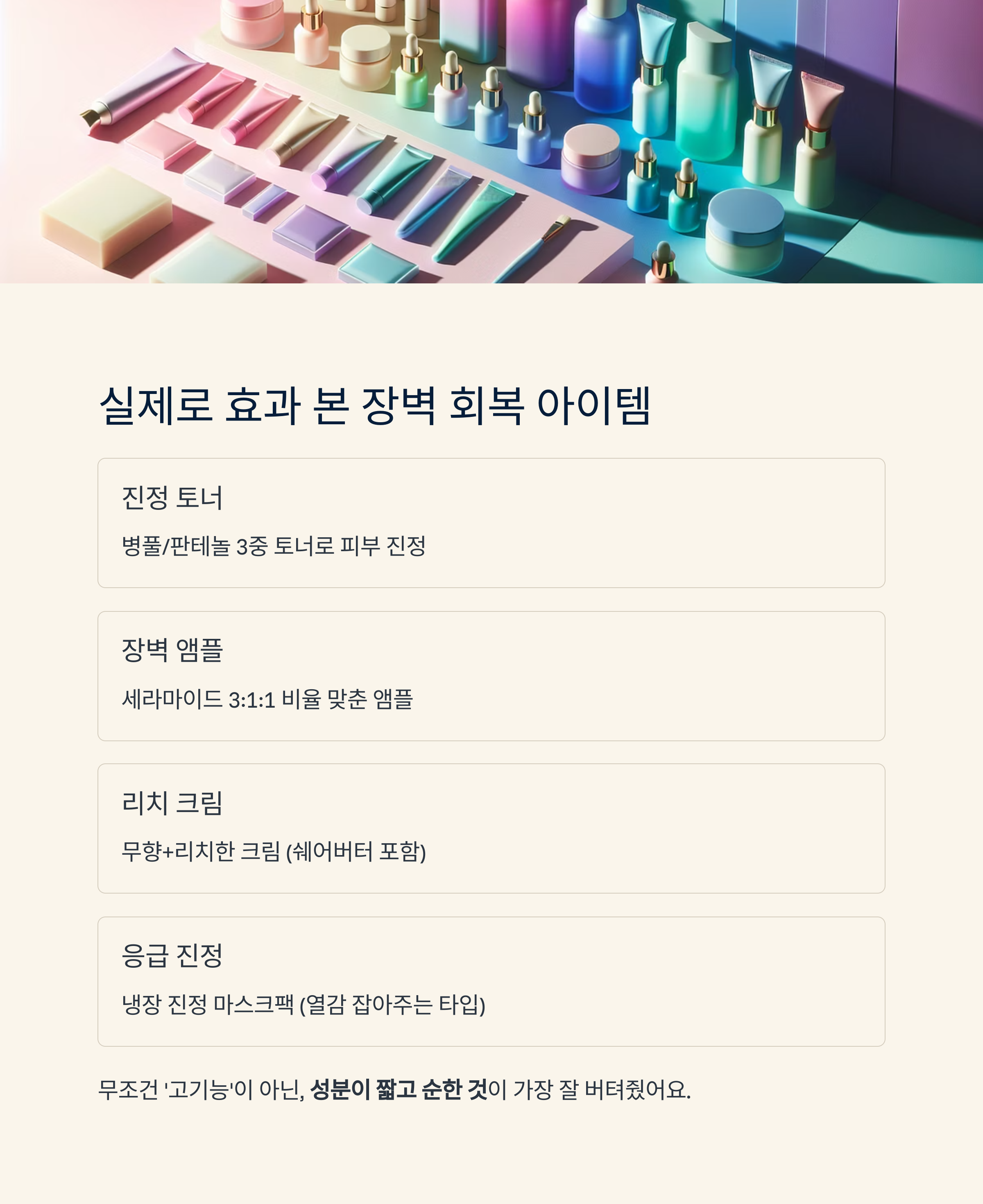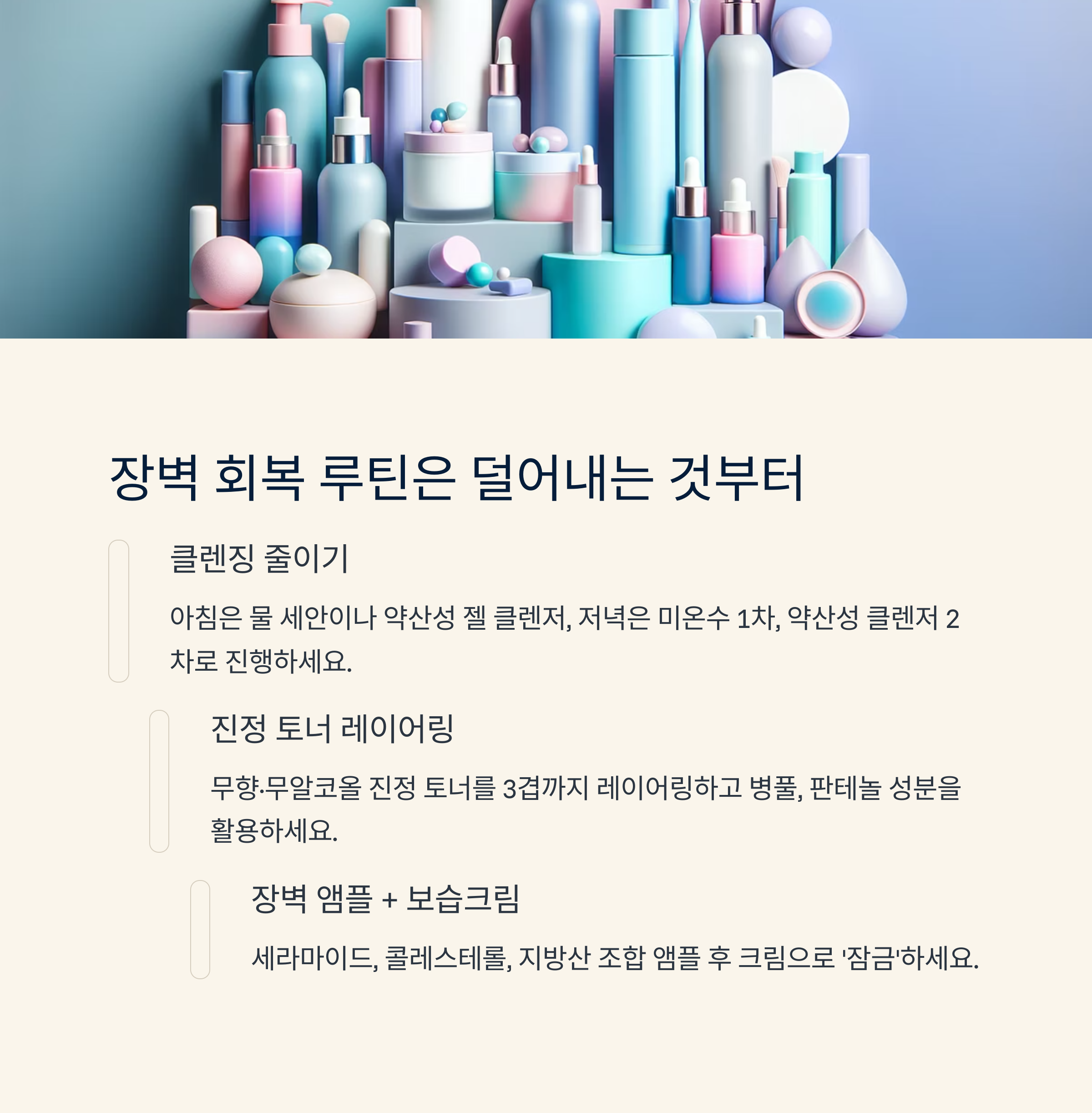 2️⃣ “장벽 회복 루틴은 화장품을 더하는 게 아니라 덜어내는 것부터 시작해요”