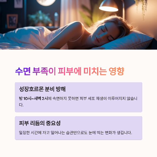"성장호르몬과 멜라토닌이 분비되는 시간대(밤 10시~새벽 2시)"에 숙면하지 못하면 피부 세포 재생이 이루어지지 않기 때문이에요.