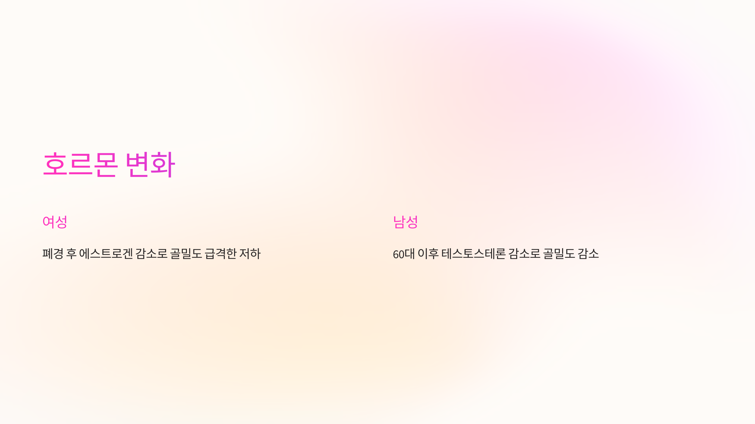 여성의 경우 폐경 이후 에스트로겐 호르몬 감소로 인해 골밀도가 급격히 줄어듭니다.