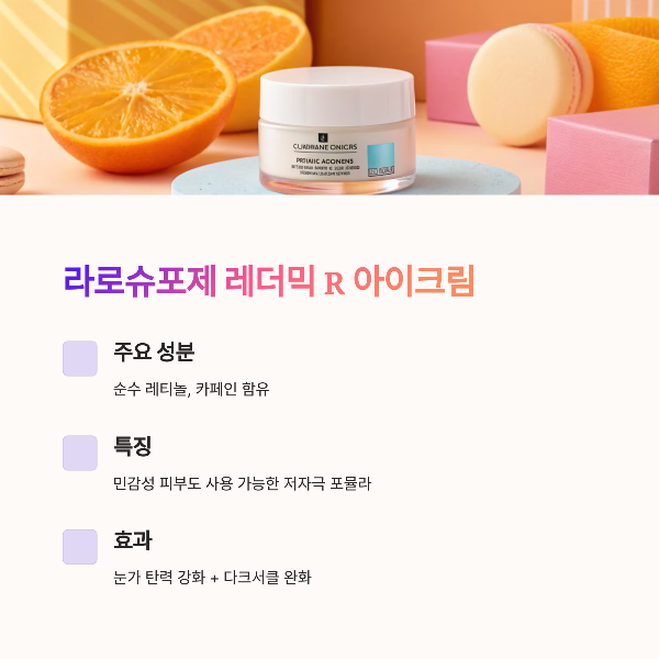눈가 피부는 자극에 예민하기 때문에 저자극 + 고기능성 성분을 함께 고려해야 합니다.