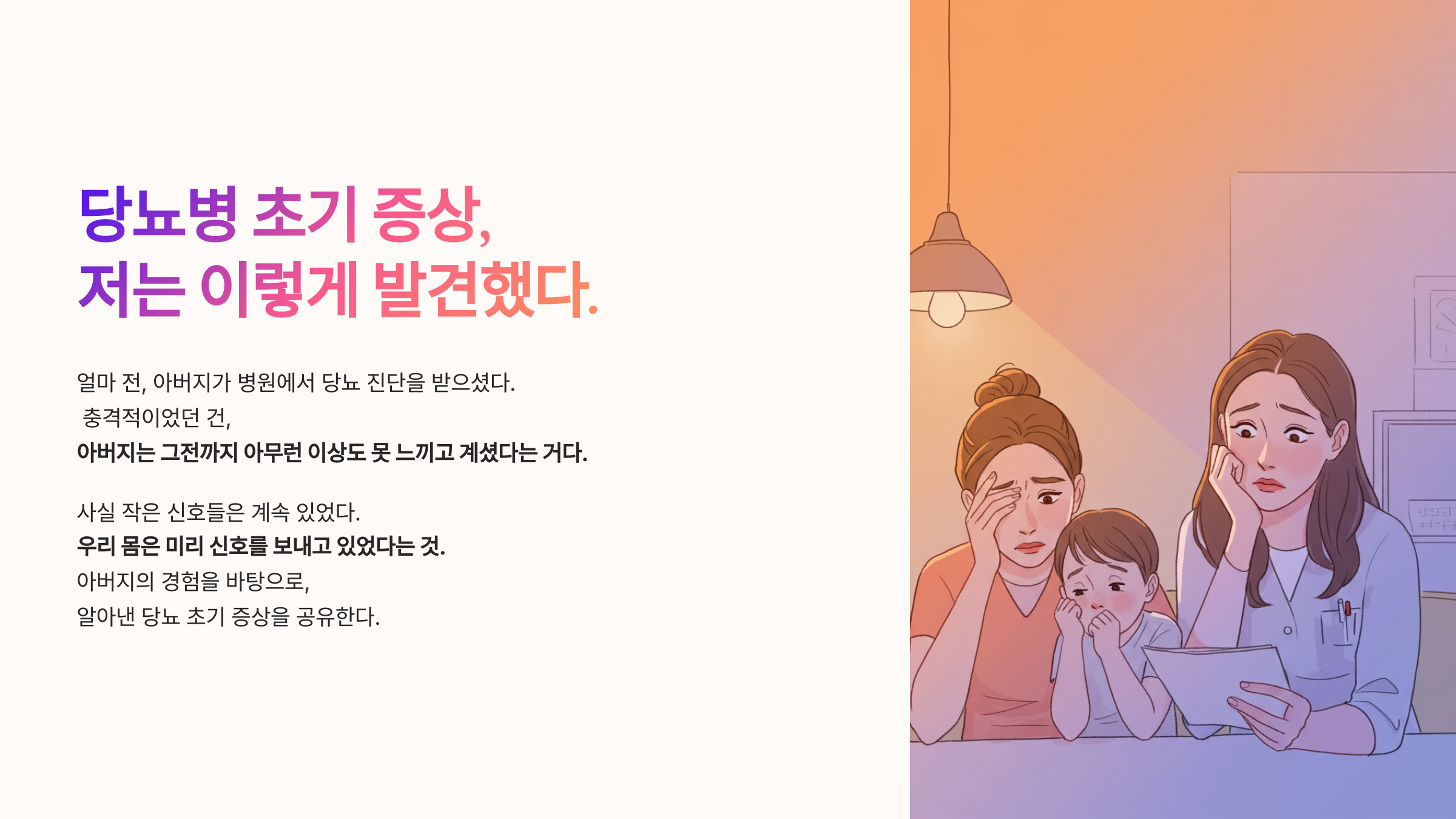 오늘은 아버지의 경험을 바탕으로, 제가 직접 알아낸 당뇨 초기 증상을 공유해볼게요.