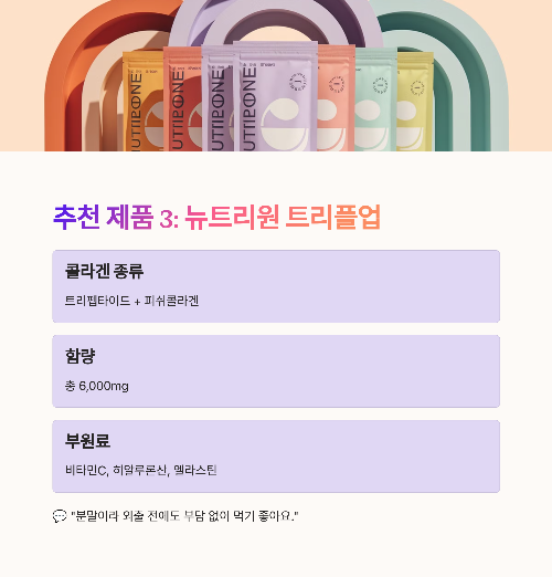 | 뉴트리원 | 트리펩타이드 + 피쉬 | 비타민C, 히알루론산 | 무맛/분말 | 휴대성 + 흡수 |