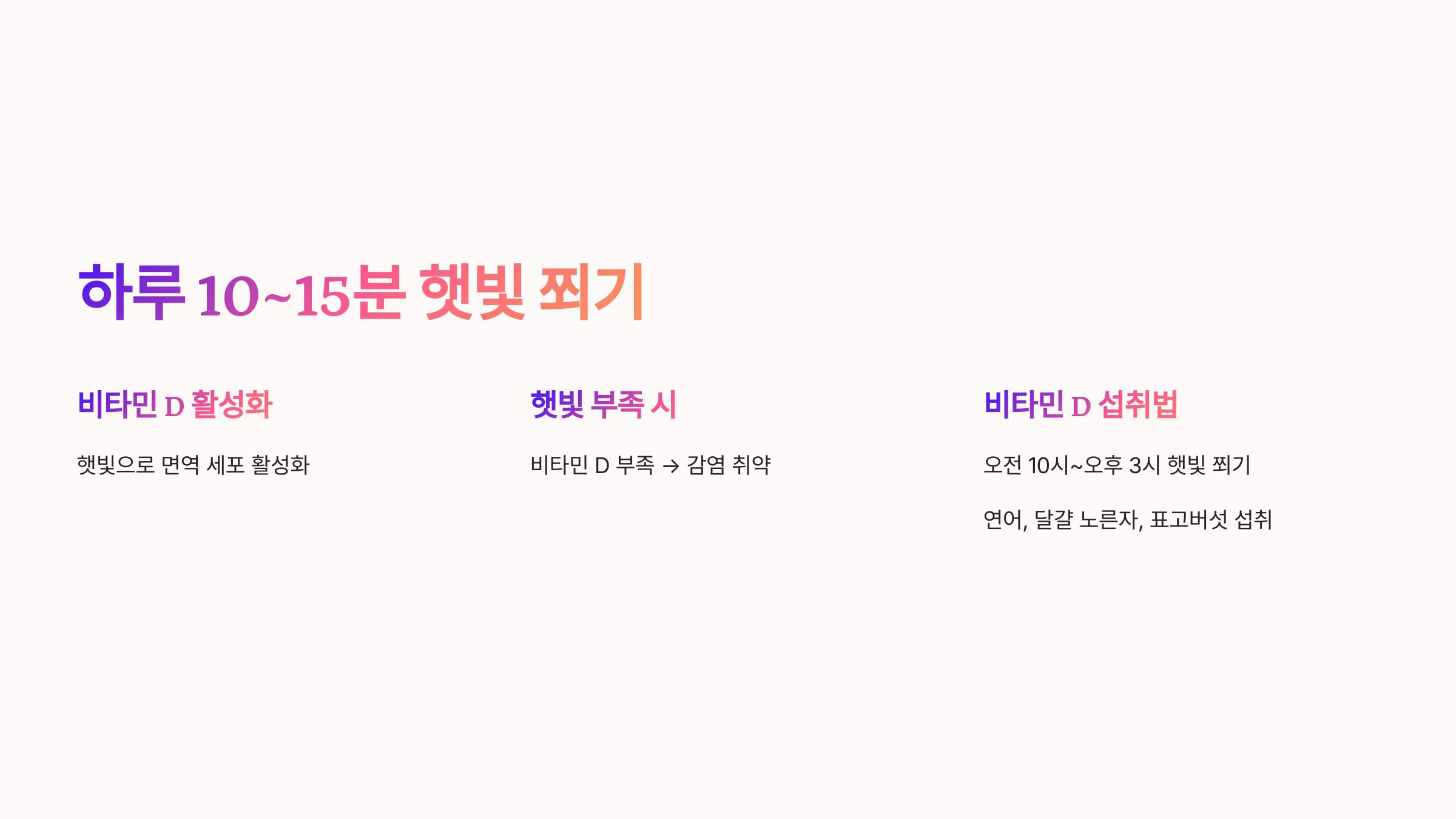✔ 매일 햇빛을 쬐며 비타민 D를 활성화하세요.