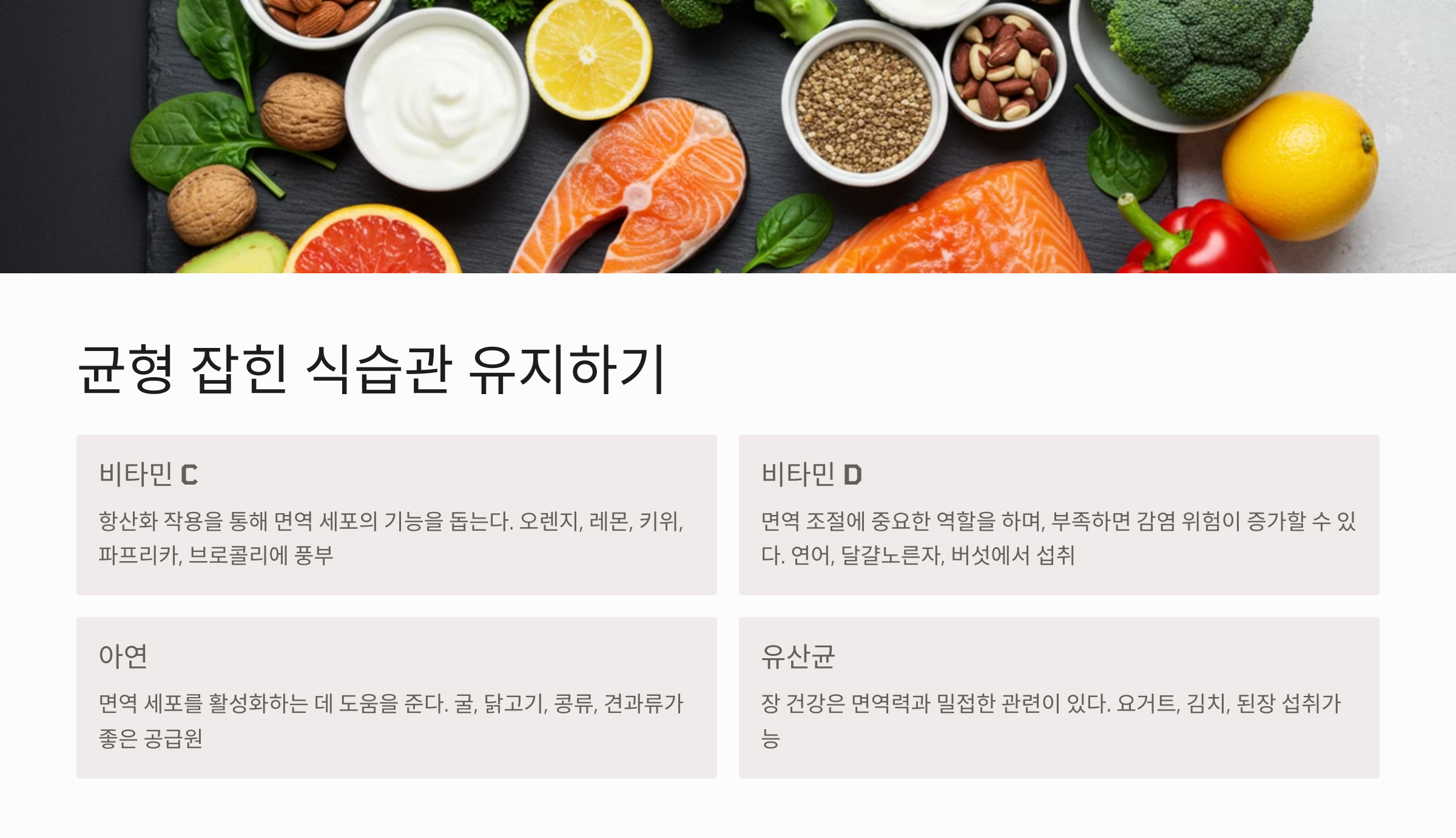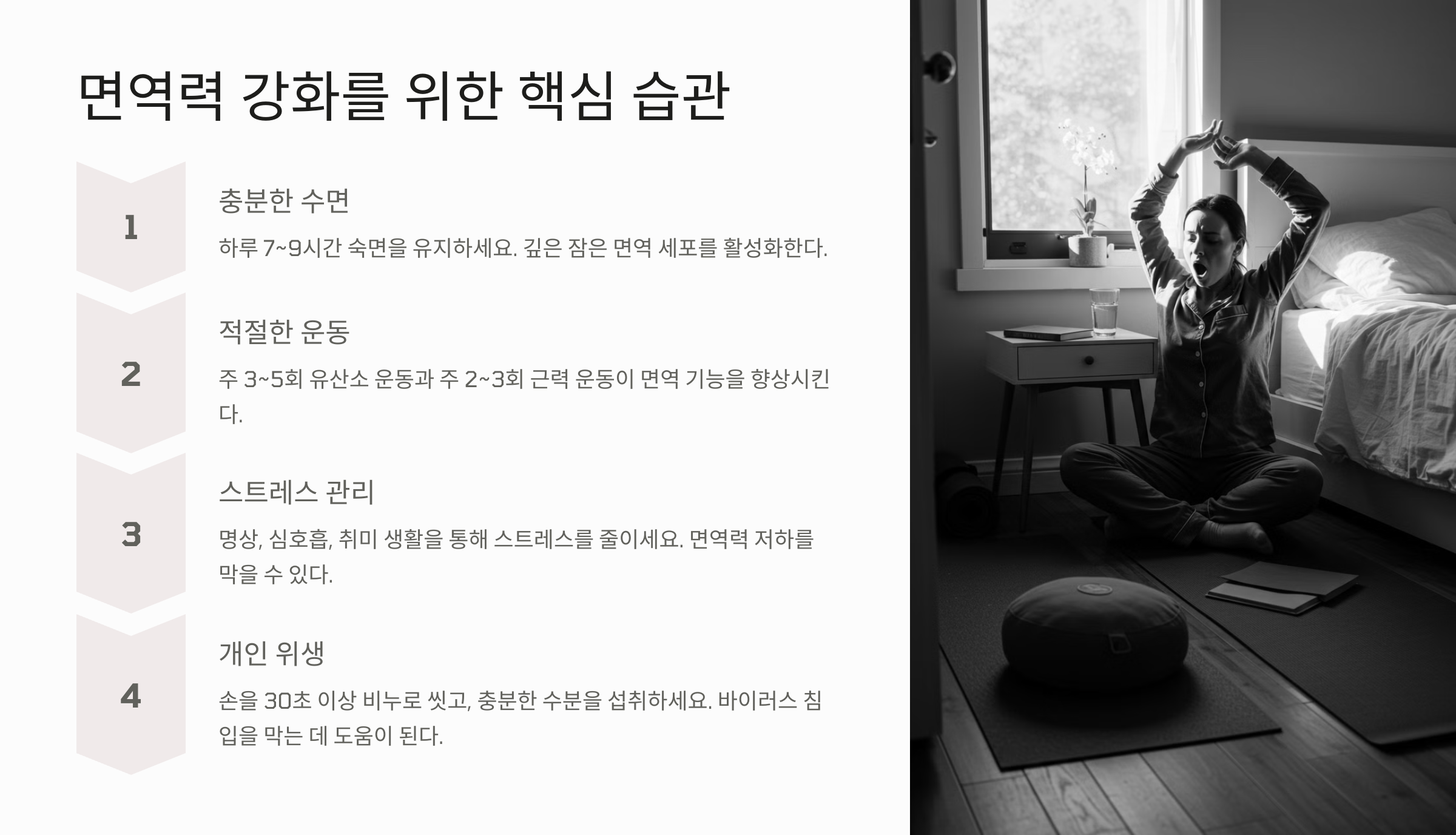 면역력을 높이기 위해서는 하나의 방법이 아니라 생활 전반의 균형 잡힌 습관이 필요합니다.