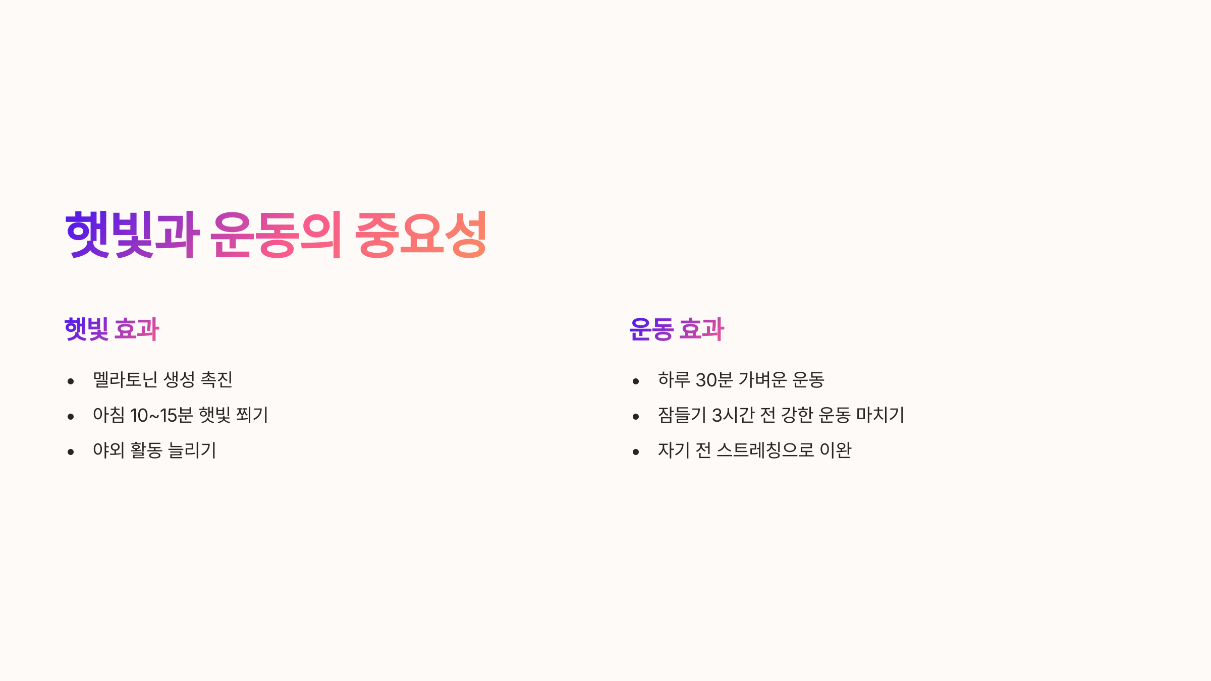✔ 낮 동안 햇빛을 충분히 쬐고 규칙적인 운동하기 – 멜라토닌 생성