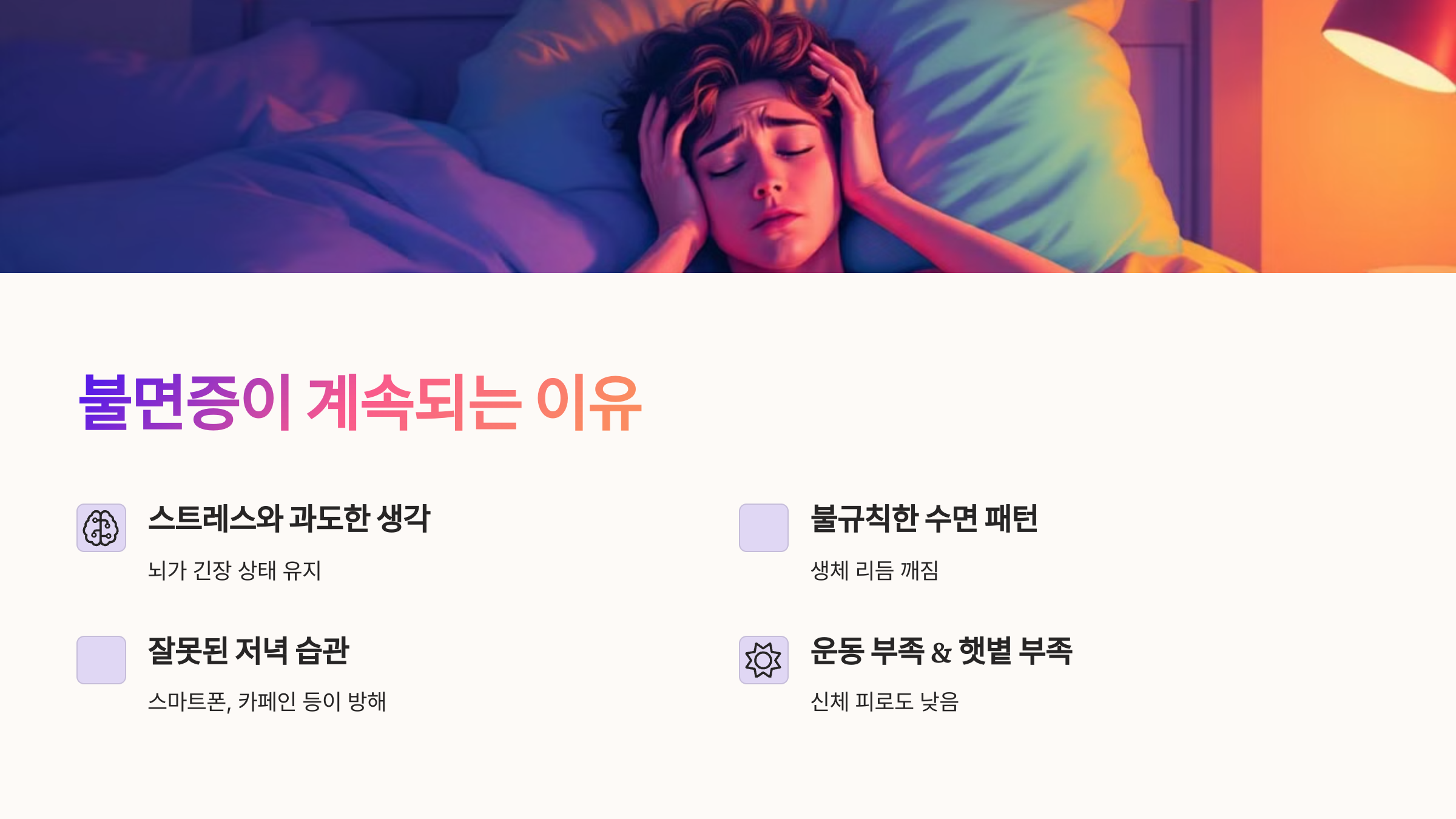 📌 불면증을 해결하려면 올바른 생활 습관과 수면 패턴을 만들어야 합니다.