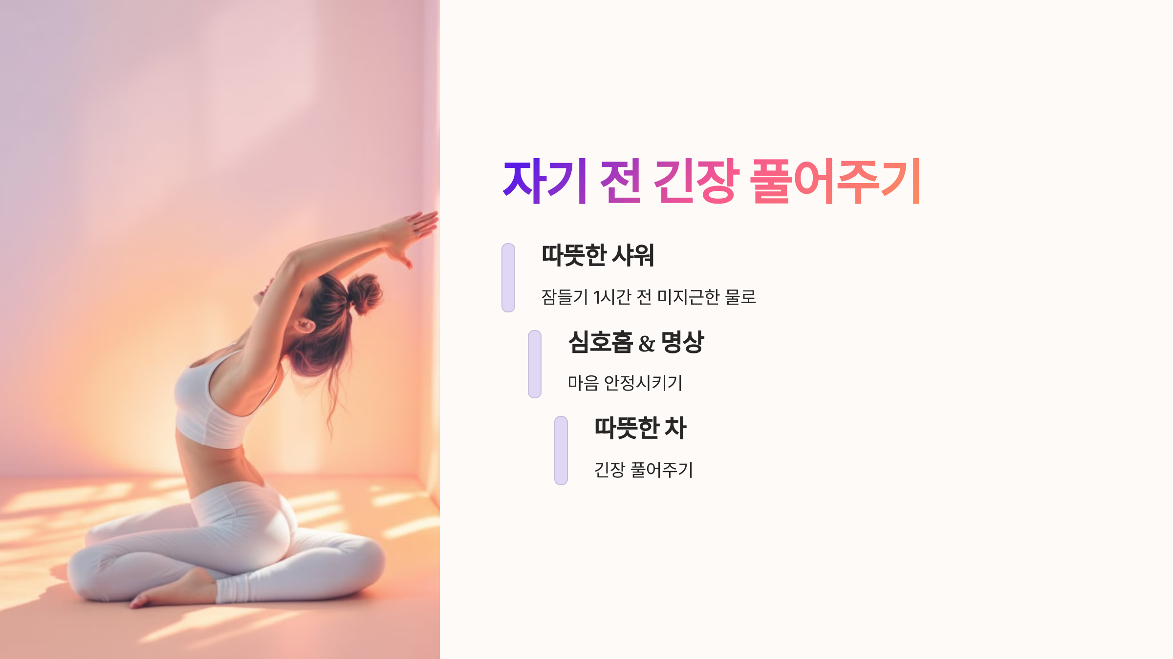 📌 자기 전 몸과 마음을 이완하면 숙면에 훨씬 도움이 됩니다.