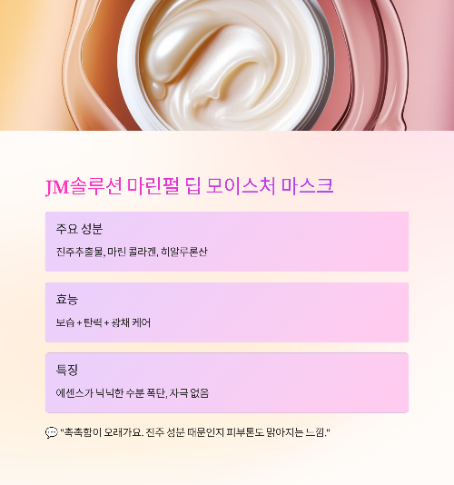 | JM 마린펄 | 진주, 마린콜라겐 | 광채 + 수분 | 진정 강함 | 민감성, 수분 부족 |