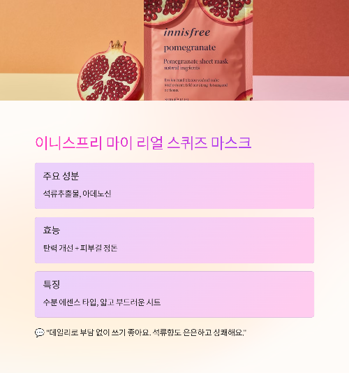 | 이니스프리 석류 | 석류추출물 | 탄력 + 생기 | 얇은 시트 | 데일리용 |