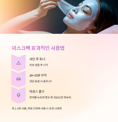 ✔ 세안 후 토너로 정돈 → 팩 10~15분 부착 → 잔여 에센스 두드려 흡수