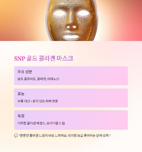 | SNP 골드 마스크 | 골드, 콜라겐 | 윤기 + 탄력 | 고보습 | 건성 & 프리미엄 |