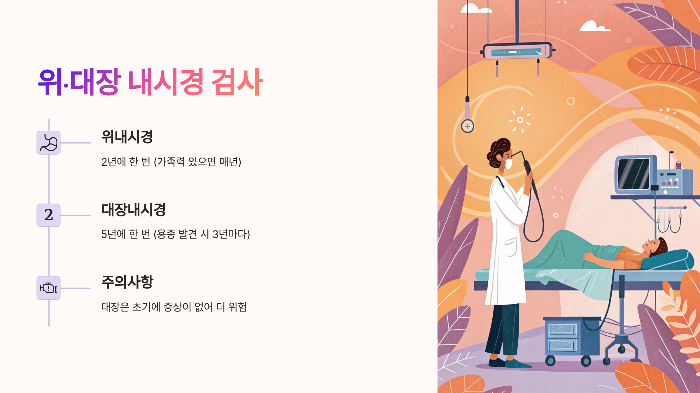 📌 대장은 초기에 증상이 없어 더 위험하니, 무증상이어도 받는 것이 좋아요.