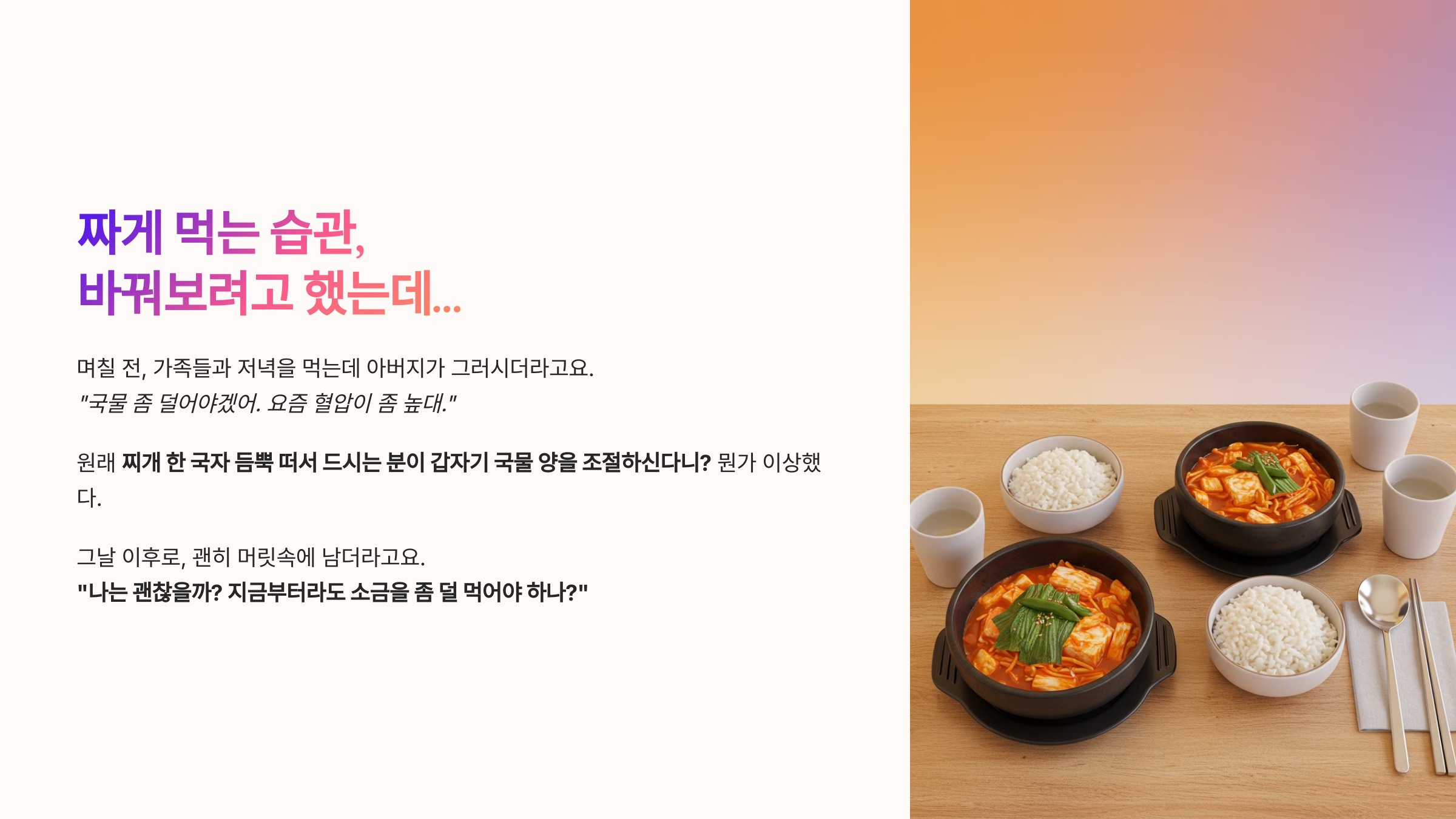"나는 괜찮을까? 지금부터라도 소금을 좀 덜 먹어야 하나?"