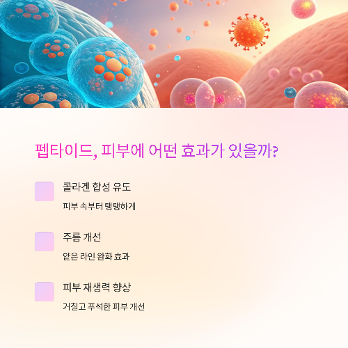펩타이드는 아미노산이 결합한 구조로, 피부의 콜라겐, 엘라스틴과 같은 단백질 생성을 촉진하는 역할을 합니다.