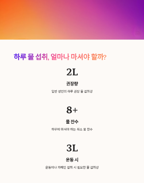 - 일반 성인의 경우 하루 약 1.5~2리터 (8잔 이상)가 권장됩니다.