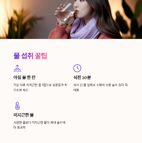 - 식전 30분 물 섭취 → 소화와 수분 흡수에 효과적