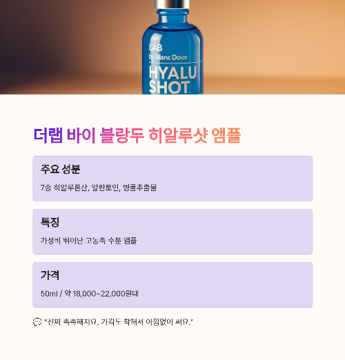 | 더랩 히알루샷 앰플 | 7중 히알루론산 + 병풀 | 50ml / 20,000 내외 | 가성비 + 고농축 | 속건조 지성, 복합성 |